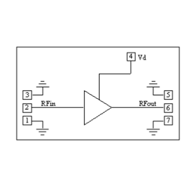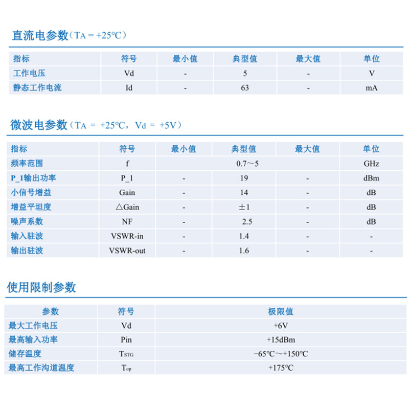 YX160023-0750 — это микросхема усилителя средней мощности, изготовленная по технологии GaAs PHEMT. Она работает в диапазоне частот от 0,7 до 5 ГГц, с коэффициентом усиления в режиме малого сигнала 14 и выходной мощностью P_1 19 дБм. Микросхема заземлена через переходное отверстие на задней стороне и работает при напряжении +5 В.